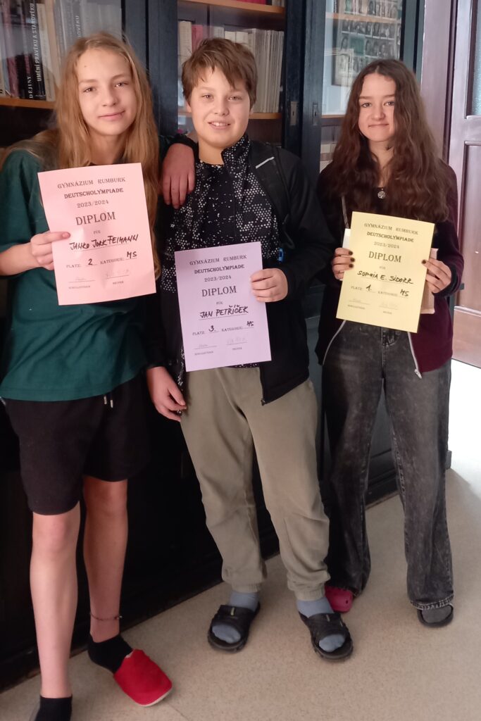 V lednu a v únoru 2024 opět proběhla školní a okresní kola olympiády z německého jazyka. Ve třech kategoriích soutěžilo celkem 130 žáků napříč ročníky. I. kategorii vyhrála Anna Holešinská ze 2.A, 2.místo získala její spolužačka Kateřina Brabencová, na bronzovém místě uspěl Duc Hung Dinh (Míša) ze stejné třídy.