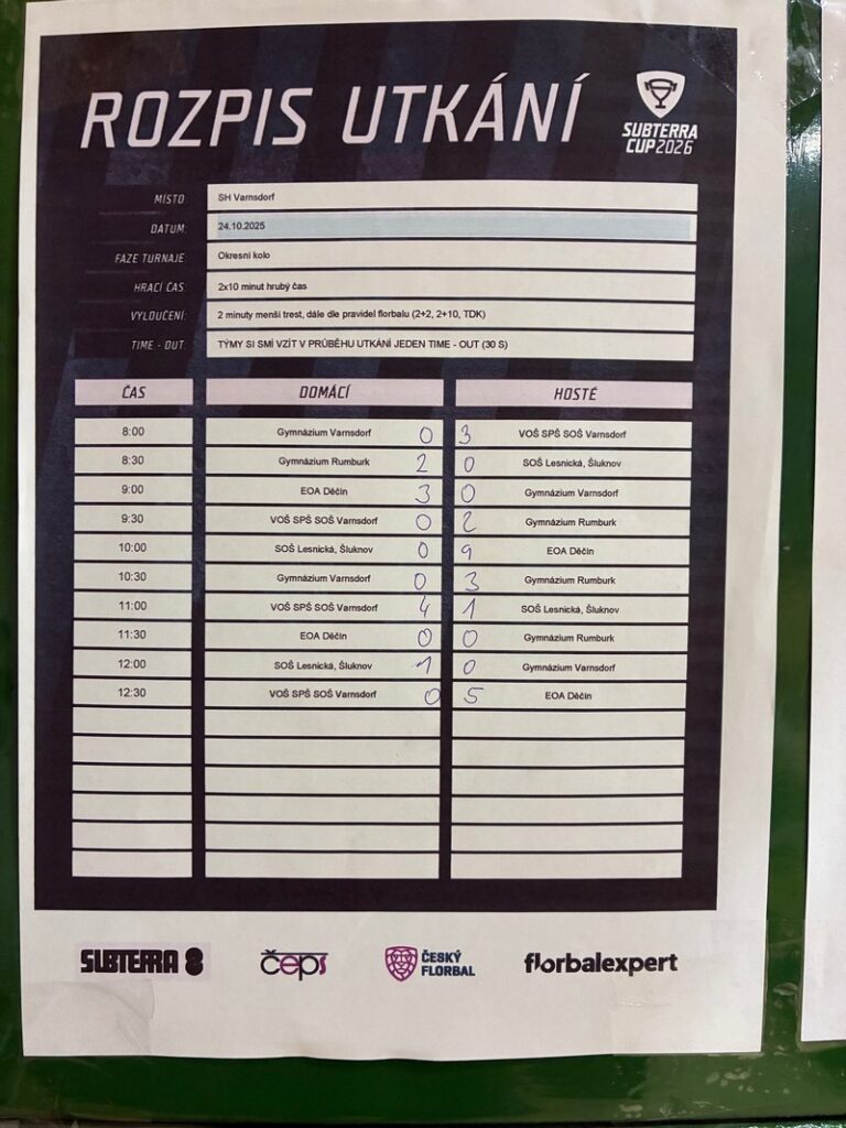 Okresní kolo florbalového turnaje Subterra Cup pro děvčata středních škol přineslo hráčkám Gymnázia Rumburk další výborný výsledek – stříbrnou medaili. Turnaj se konal v pátek 24. října 2025 ve sportovní hale ve Varnsdorfu, takže naše hráčky měly výhodu známého prostředí.