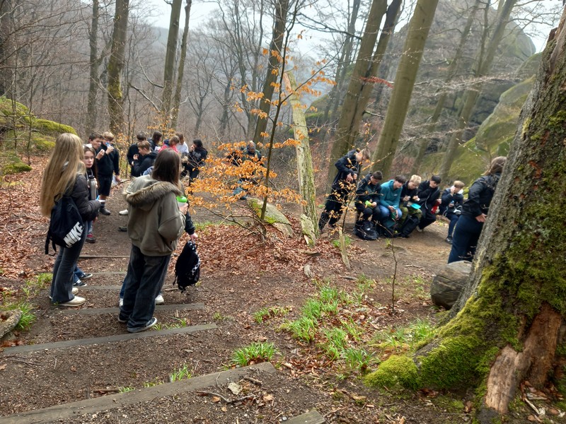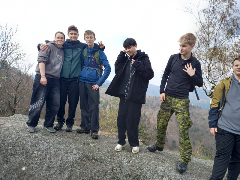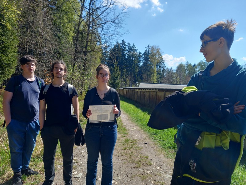 První den jsme byli v Jizerských horách, v rezervaci Jizerské bučiny. Nejdřív jsme se rozdělili na 2 poloviny. Jedna čekala u autobusu a plnila úkoly v pracovním listu. Byly zaměřené na vzájemné poznávání. Druhá mezitím vyšla na trasu, abychom se nesetkali. Po cca 15 min šla první polovina za nimi. Po cestě jsme si všímali přírody a vyplňovali pracovní list o tom, co v lese vidíme, co je výtvorem člověka, o jaký druh lesa se jedná, jaké je tam podloží apod. Když jsme vyšli nahoru, tak se většina šla podívat na skalní hrad. Potom jsme se vrátili k autobusu. Jakmile jsme byli dole, dali jsme si oběd a jeli jsme domů.