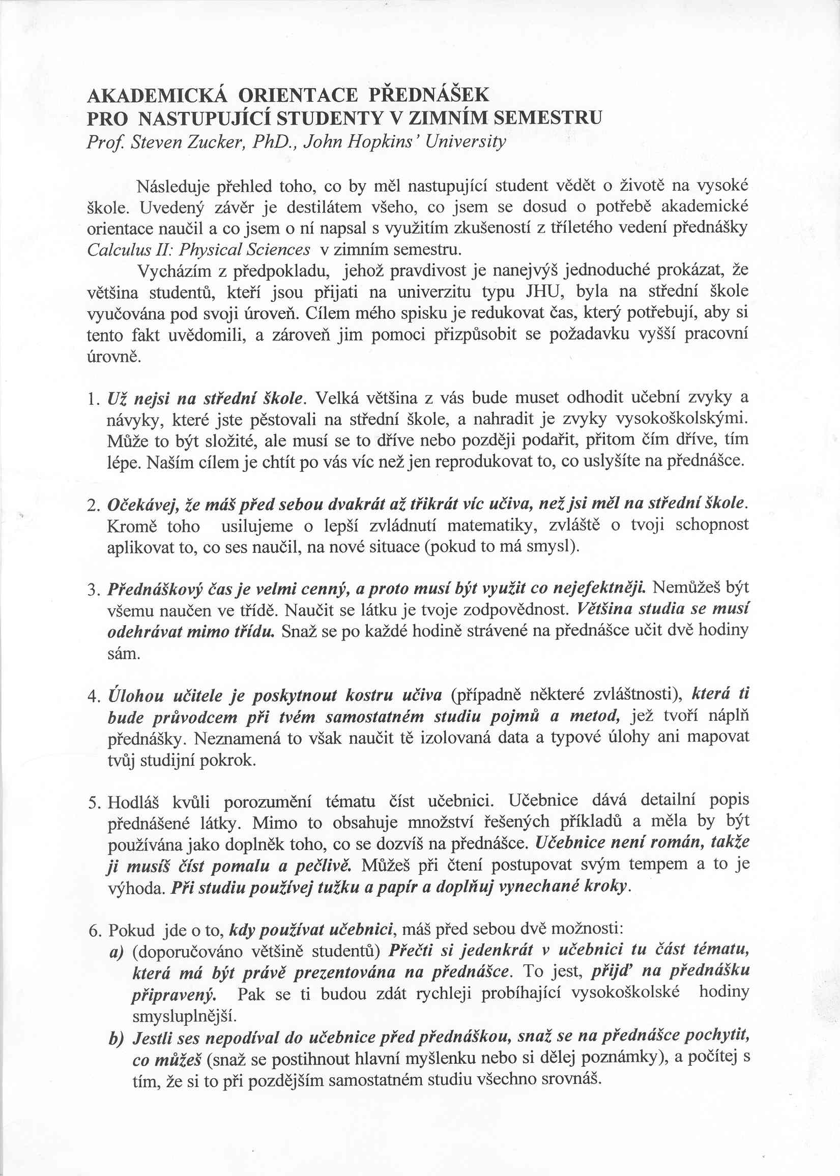 Předně bych chtěl upozornit na následující text: Steven Zucker: Akademická orientace přednášek pro nastupující studenty. Doporučuji si jej pročíst a zařídit se podle toho.